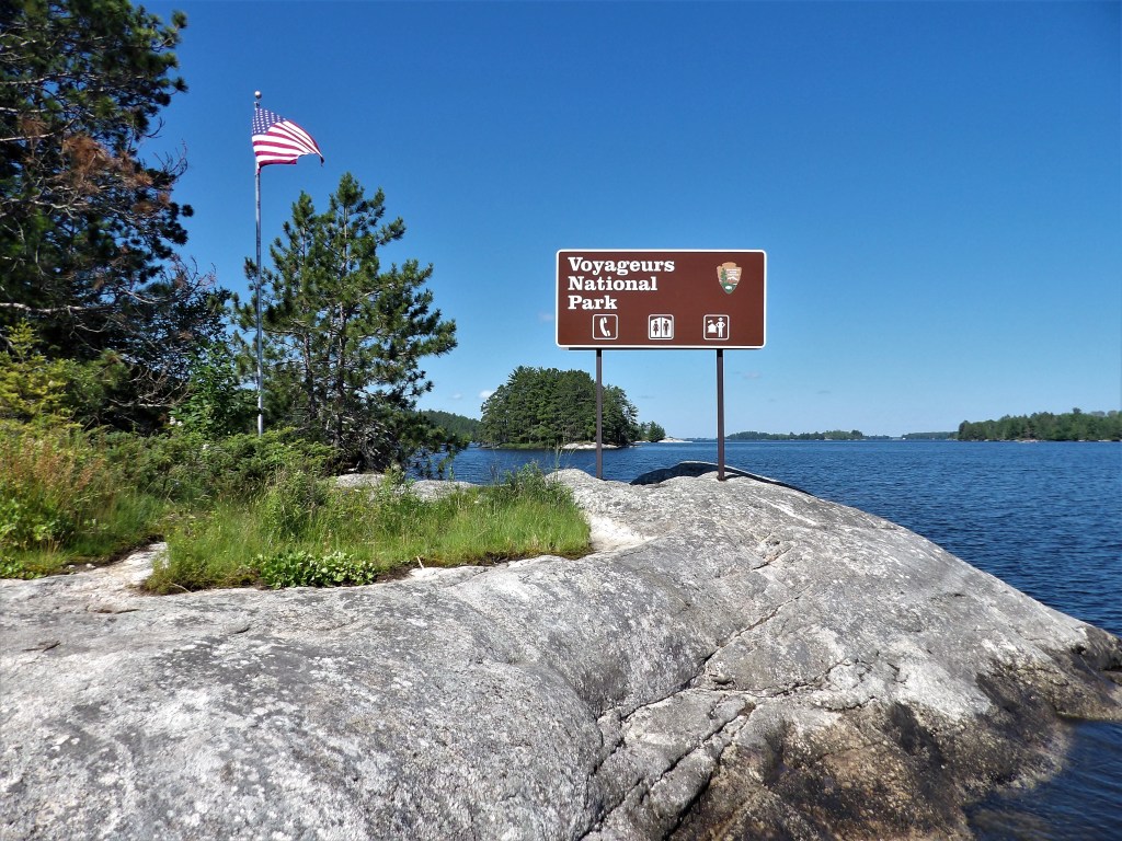 Finally, we made it. The clouds and forest are behind us, and there’s nothing but blue waters under blue skies here. It’s breathtakingly beautiful. I’ve visited a number of national parks, but this is the first that has its roadside sign on a rock at the edge of a lake. We should’ve brought a canoe!