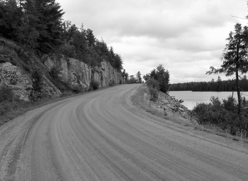 Apparently, a lot of hikers pass through here. There are people biking it, and a few cars (with their obligatory canoes) suddenly popping up on the roller-coaster corners, but mostly it’s just pristine wilderness of rocks, trees, and lakes. I hope the sky clears soon.
